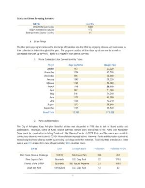 The City of Arlington , Keep Arlington Beautiful affiliate was disbanded in FY18 due to lack of Board activity and participation . However , some of KABs related activities remain were transferred to the Parks and Recreation Department for coordination including Creek and Litter Cleanup Events . In FY20 , Parks and Recreation was unable to conduct any clean-up events due to COVID-19 social distancing restrictions . However , Parks and Recreation sponsored several neighborhood cleanup events by providing trash bags and other materials . Total volunteer attendance at these events was 311 citizens for a total of approximately 961 volunteer hours .