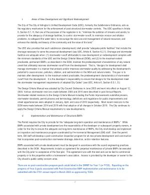 The City of The City of Arlington ’ s Unified Development Code ( UDC ), formerly the Subdivisions Ordinance , acts as the regulatory mechanism for the enforcement of post-structural stormwater controls . The UDC specifies in Article 6 , Section 6.1 , H , that one of the purposes of the regulation is to : “ minimize the pollution of streams and ponds ; to provide for the adequacy of drainage facilities ; to control stormwater runoff ; to minimize erosion and siltation problems , to safeguard the water table ; to encourage the wise use and management of natural resources ; and enhance the stability and beauty of the community and the value of the land .”