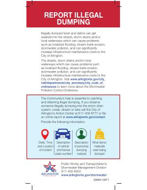 The Community ’ s help is essential to catching and deterring illegal dumping . If you observe someone illegally dumping into the storm drain ����������������������������������������������� ������������������������������������������������� an online report at www . arlingtontx . gov / contact .