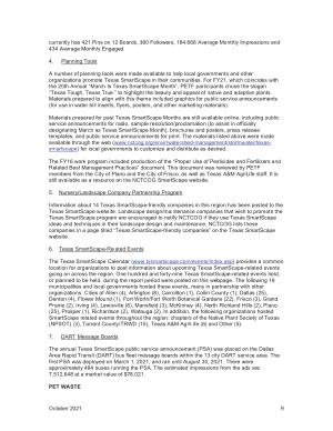 The annual Texas SmartScape public service announcement ( PSA ) was placed on the Dallas Area Rapid Transit ( DART ) bus fleet message boards within the 13 city DART service area . The first PSA was deployed on March 1 , 2021 , and ran until August 30 , 2021 . There were approximately 484 buses running the PSA . The estimated impressions from the ads are 7,512,648 at a market value of $ 78,021 .