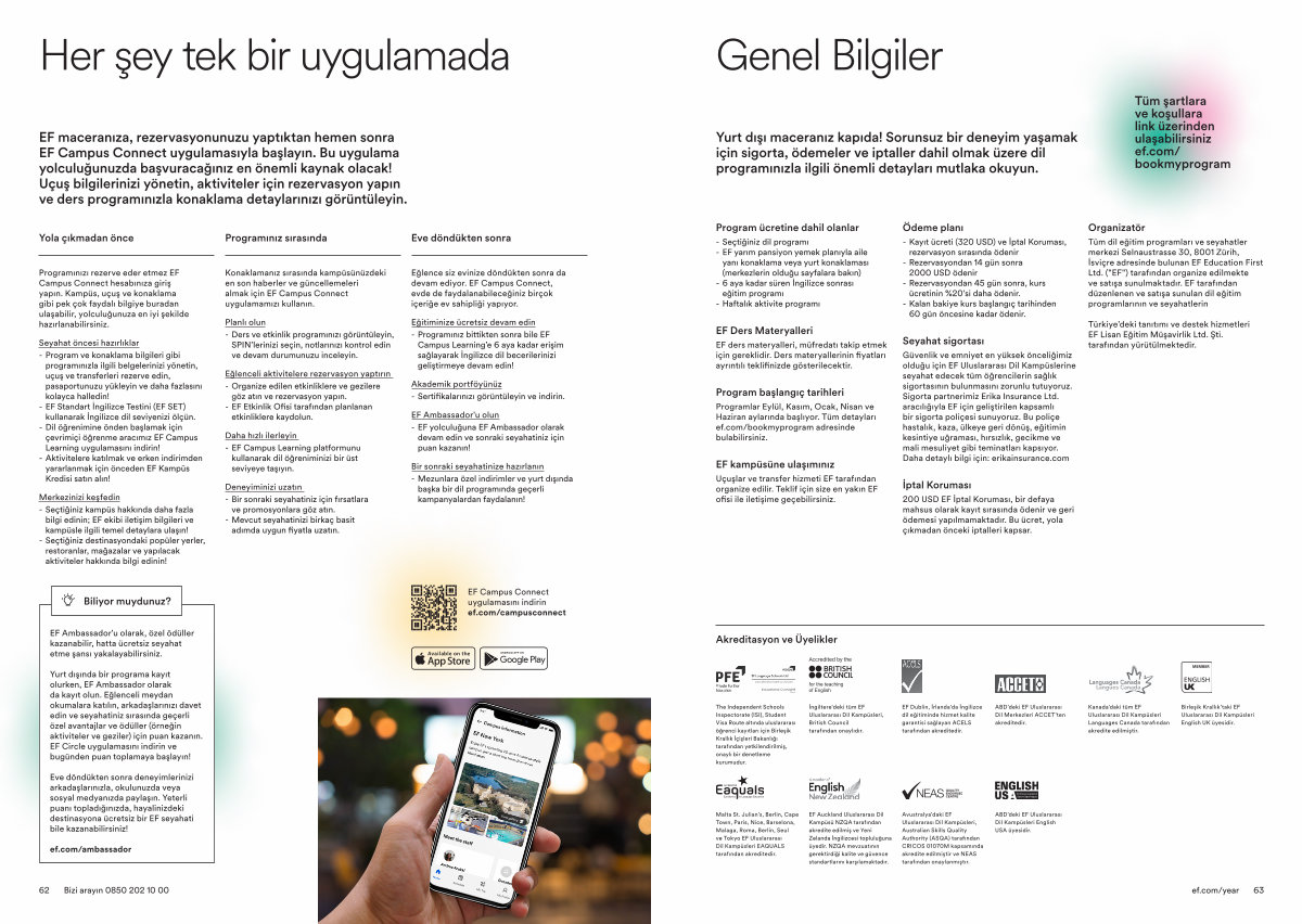 EF maceranıza, rezervasyonunuzu yaptıktan hemen sonra EF Campus Connect uygulamasıyla başlayın. Bu uygulama yolculuğunuzda başvuracağınız en önemli kaynak olacak! Uçuş bilgilerinizi yönetin, aktiviteler için rezervasyon yapın ve ders programınızla konaklama detaylarınızı görüntüleyin.