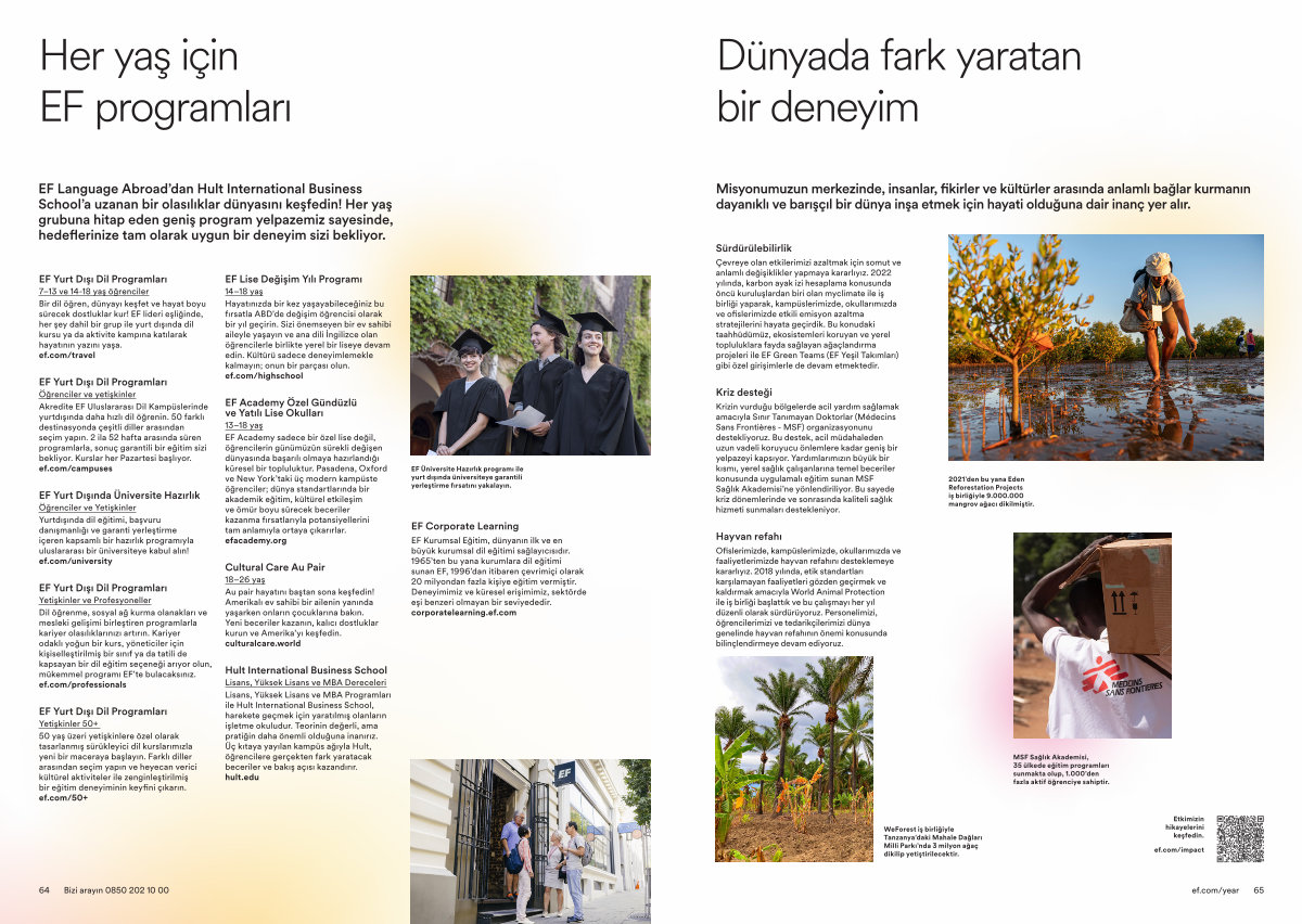 Çevreye olan etkilerimizi azaltmak için somut ve anlamlı değişiklikler yapmaya kararlıyız. 2022 yılında, karbon ayak izi hesaplama konusunda öncü kuruluşlardan biri olan myclimate ile iş birliği yaparak, kampüslerimizde, okullarımızda ve ofislerimizde etkili emisyon azaltma stratejilerini hayata geçirdik. Bu konudaki taahhüdümüz, ekosistemleri koruyan ve yerel topluluklara fayda sağlayan ağaçlandırma projeleri ile EF Green Teams( EF Yeşil Takımları) gibi özel girişimlerle de devam etmektedir.