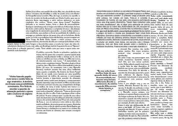 Seu próximo passo é dedicar-se a produtora Paisagem Filmes, que montou em sociedade com amigos, para fazer as peças e os filmes "em que realmente acredita". O primeiro longa produzido pela atriz começa. Ser rodado em maio. Trata-se d comédia O Casamento de Gorete, em que gata uma pequena participação como uma drag queen cibernética. "Quero fazer trabalhos cada vez mais desafiadores", diz. A julgar pela animação de Leticia, muitos vêm por aí. Sobre eles, maternidade (ah, sim, ela quer ter mais um filho!) e boa forma, a estrela fala na entrevista a seguir.