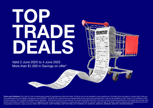 Terms and Conditions: Only valid in Costco warehouses located in Australia and while stock lasts. All items may not be available in every warehouse. Purchase limits may apply to certain items. See your local warehouse for more details. Savings are valid 02 / 06 / 25- 04 / 06 / 25 only. Items shown are representations and colours and variants shown may not be available on sale. Liquor is not available in QLD and SA locations. WA is subject to updated liquor legislation. * Total amount saved on purchase of one of each advertised sale item. Services, products and pricing featured on this page are accurate when posted and subject to change in the future. It is against the law to sell or supply alcohol to, or obtain alcohol on behalf of, a person under the age of 18 years. Costco supports the responsible service and consumption of alcohol. Liquor Licence: NSW-LIQP770010247, LIQP770016625, LIQP770017058. ACT-14005609. VIC-32061303, 32064440, 32065682, 32067781. WA-603213623419.