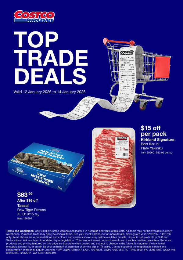 Terms and Conditions: Only valid in Costco warehouses located in Australia and while stock lasts. All items may not be available in every warehouse. Purchase limits may apply to certain items. See your local warehouse for more details. Savings are valid 12 / 01 / 26- 14 / 01 / 26 only. Items shown are representations and colours and variants shown may not be available on sale. Liquor is not available in QLD and SA locations. WA is subject to updated liquor legislation. * Total amount saved on purchase of one of each advertised sale item. Services, products and pricing featured on this page are accurate when posted and subject to change in the future. It is against the law to sell or supply alcohol to, or obtain alcohol on behalf of, a person under the age of 18 years. Costco supports the responsible service and consumption of alcohol. Liquor Licence: NSW-LIQP770010247, LIQP770016625, LIQP770017058. ACT-14005609. VIC-32061303, 32064440, 32065682, 32067781. WA-603213623419.