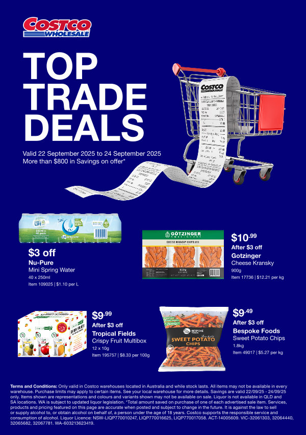 Terms and Conditions: Only valid in Costco warehouses located in Australia and while stock lasts. All items may not be available in every warehouse. Purchase limits may apply to certain items. See your local warehouse for more details. Savings are valid 22 / 09 / 25- 24 / 09 / 25 only. Items shown are representations and colours and variants shown may not be available on sale. Liquor is not available in QLD and SA locations. WA is subject to updated liquor legislation. * Total amount saved on purchase of one of each advertised sale item. Services, products and pricing featured on this page are accurate when posted and subject to change in the future. It is against the law to sell or supply alcohol to, or obtain alcohol on behalf of, a person under the age of 18 years. Costco supports the responsible service and consumption of alcohol. Liquor Licence: NSW-LIQP770010247, LIQP770016625, LIQP770017058. ACT-14005609. VIC-32061303, 32064440, 32065682, 32067781. WA-603213623419.