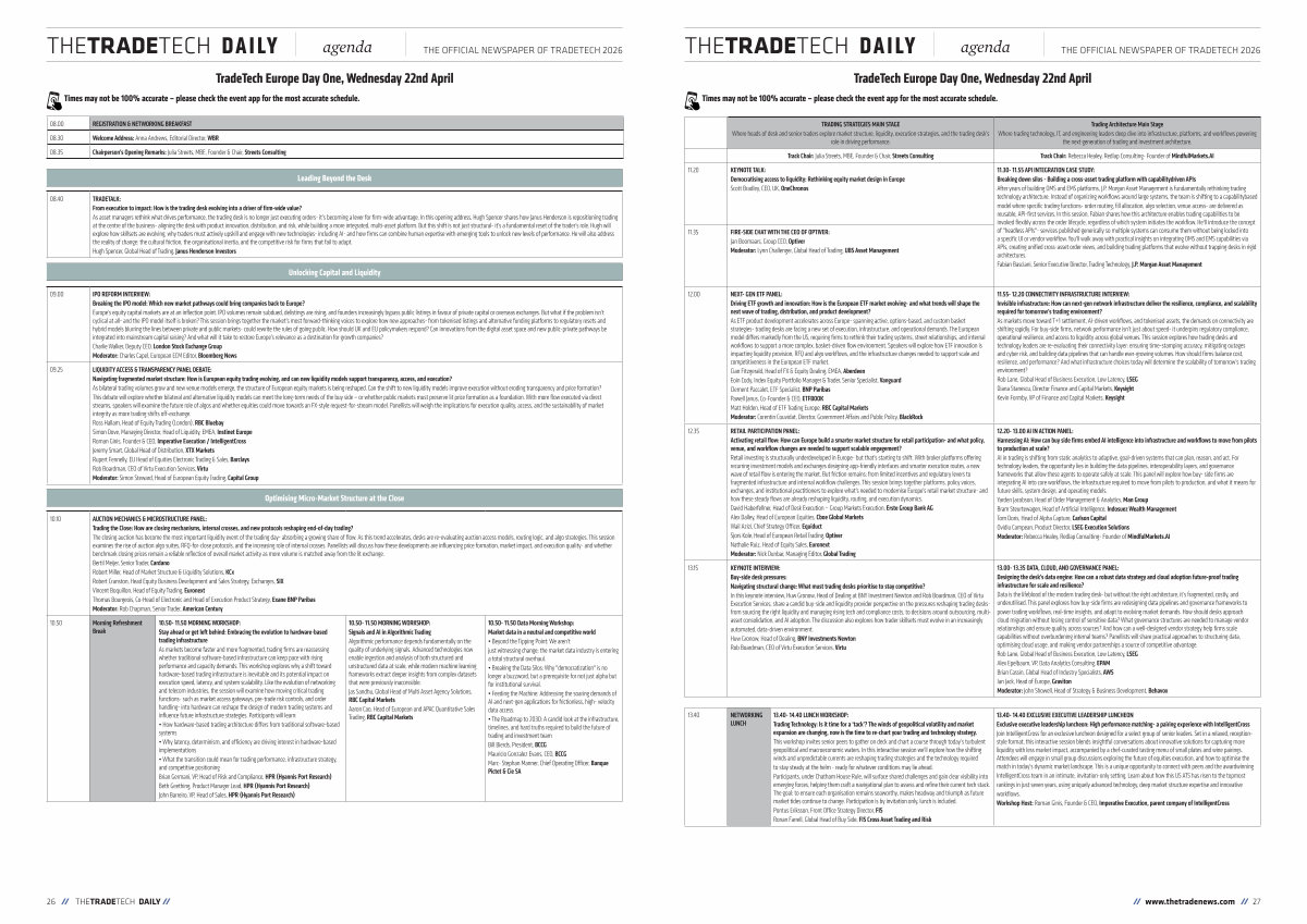 09.25 LIQUIDITY ACCESS & TRANSPARENCY PANEL DEBATE: Navigating fragmented market structure: How is European equity trading evolving, and can new liquidity models support transparency, access, and execution? As bilateral trading volumes grow and new venue models emerge, the structure of European equity markets is being reshaped. Can the shift to new liquidity models improve execution without eroding transparency and price formation? This debate will explore whether bilateral and alternative liquidity models can meet the long-term needs of the buy side – or whether public markets must preserve lit price formation as a foundation. With more flow executed via direct streams, speakers will examine the future role of algos and whether equities could move towards an FX-style request-for-stream model. Panellists will weigh the implications for execution quality, access, and the sustainability of market integrity as more trading shifts off-exchange. Ross Hallam, Head of Equity Trading( London), RBC Bluebay Simon Dove, Managing Director, Head of Liquidity, EMEA, Instinet Europe Roman Ginis, Founder & CEO, Imperative Execution / IntelligentCross Jeremy Smart, Global Head of Distribution, XTX Markets Rupert Fennelly, EU Head of Equities Electronic Trading & Sales, Barclays Rob Boardman, CEO of Virtu Execution Services, Virtu Moderator: Simon Steward, Head of European Equity Trading, Capital Group