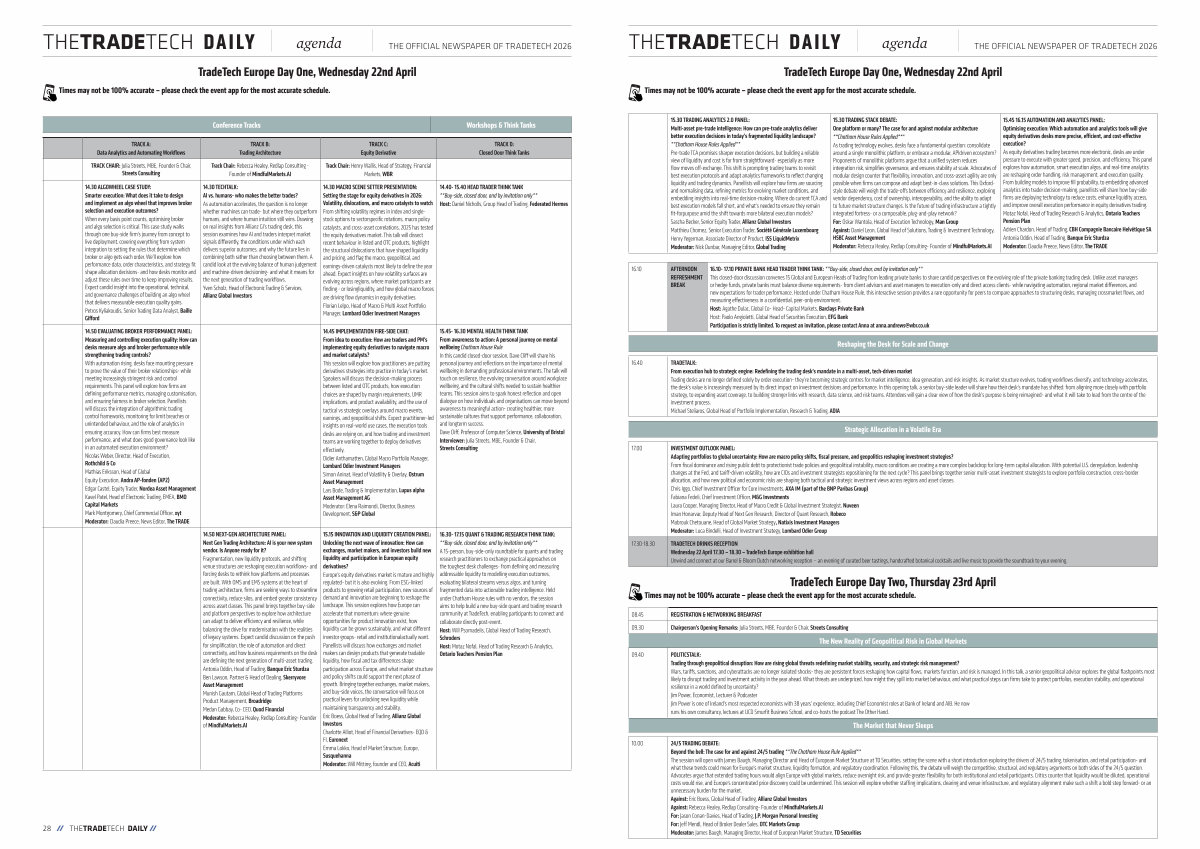 16.40 TRADETALK: From execution hub to strategic engine: Redefining the trading desk’ s mandate in a multi-asset, tech-driven market Trading desks are no longer defined solely by order execution- they’ re becoming strategic centres for market intelligence, idea generation, and risk insights. As market structure evolves, trading workflows diversify, and technology accelerates, the desk’ s value is increasingly measured by its direct impact on investment decisions and performance. In this opening talk, a senior buy-side leader will share how their desk’ s mandate has shifted: from aligning more closely with portfolio strategy, to expanding asset coverage, to building stronger links with research, data science, and risk teams. Attendees will gain a clear view of how the desk’ s purpose is being reimagined- and what it will take to lead from the centre of the investment process. Michael Steliaros, Global Head of Portfolio Implementation, Research & Trading, ADIA