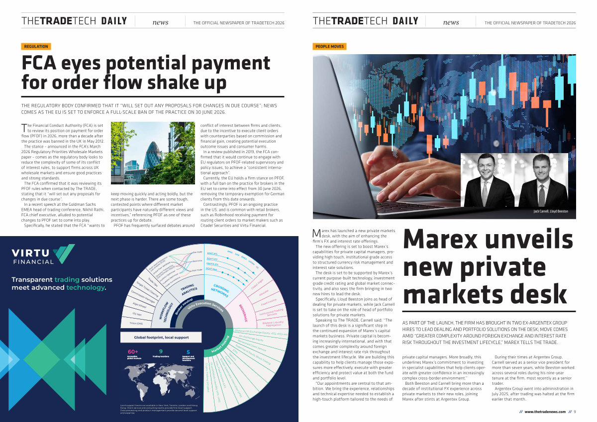 Marex has launched a new private markets desk, with the aim of enhancing the firm’ s FX and interest rate offerings. The new offering is set to boost Marex’ s capabilities for private capital managers, providing high touch, institutional grade access to structured currency risk management and interest rate solutions. The desk is set to be supported by Marex’ s current purpose-built technology, investment grade credit rating and global market connectivity, and also sees the firm bringing in two new hires to lead the desk. Specifically, Lloyd Beeston joins as head of dealing for private markets, while Jack Carnell is set to take on the role of head of portfolio solutions for private markets. Speaking to The TRADE, Carnell said:“ The launch of this desk is a significant step in the continued expansion of Marex’ s capital markets business. Private capital is becoming increasingly international, and with that comes greater complexity around foreign exchange and interest rate risk throughout the investment lifecycle. We are building this capability to help clients manage those exposures more effectively, execute with greater efficiency and protect value at both the fund and portfolio level.“ Our appointments are central to that ambition. We bring the experience, relationships and technical expertise needed to establish a high-touch platform tailored to the needs of