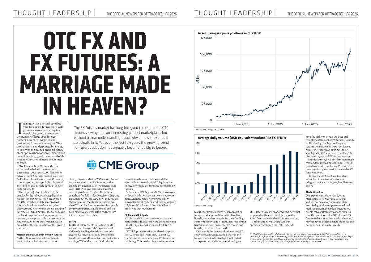 closely align it with the OTC market. Recent enhancements to our FX futures market include the addition of new currency pairs with SGD, THB and IDR added in 2025, and the provision of regionally relevant snapshots for daily valuations, including 4:00 pm London, 4:00 pm New York and 3:00 pm Tokyo time. Yet the ability to truly bridge the OTC and FX futures markets is arguably the most important development, and we have made a concerted effort on three key initiatives to achieve this.