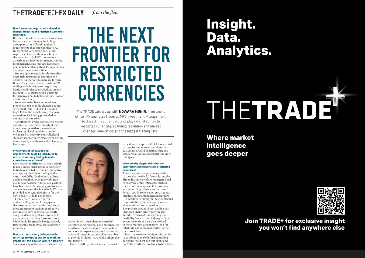 The TRADE catches up with NOWARA MUNIR, investment officer, FX and rates trader at MFS Investment Management, to dissect the current state of play when it comes to restricted currencies, spanning regulation and market changes, innovation, and the biggest trading risks.