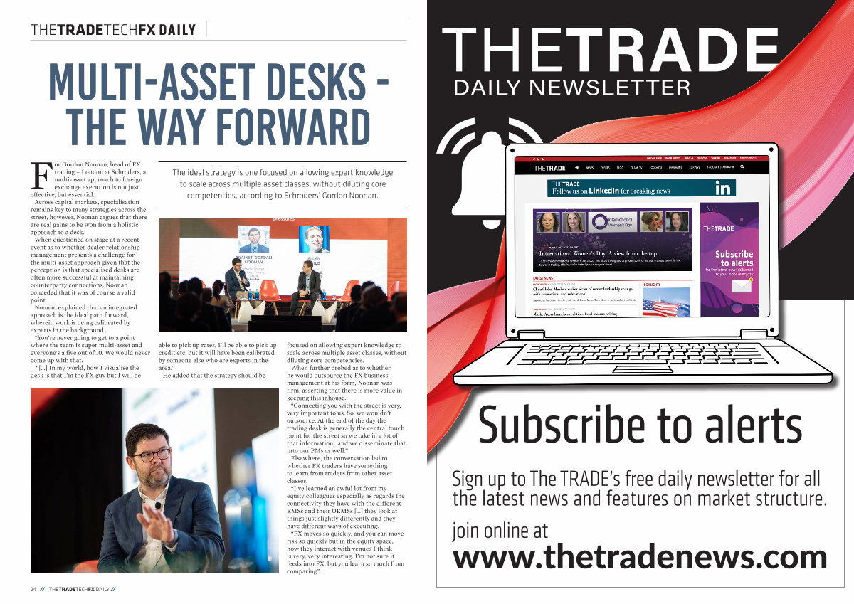 able to pick up rates, I’ ll be able to pick up credit etc. but it will have been calibrated by someone else who are experts in the area.” He added that the strategy should be focused on allowing expert knowledge to scale across multiple asset classes, without diluting core competencies. When further probed as to whether he would outsource the FX business management at his form, Noonan was firm, asserting that there is more value in keeping this inhouse.“ Connecting you with the street is very, very important to us. So, we wouldn’ t outsource. At the end of the day the trading desk is generally the central touch point for the street so we take in a lot of that information, and we disseminate that into our PMs as well.” Elsewhere, the conversation led to whether FX traders have something to learn from traders from other asset classes.“ I’ ve learned an awful lot from my equity colleagues especially as regards the connectivity they have with the different EMSs and their OEMSs […] they look at things just slightly differently and they have different ways of executing.“ FX moves so quickly, and you can move risk so quickly but in the equity space, how they interact with venues I think is very, very interesting. I’ m not sure it feeds into FX, but you learn so much from comparing”.
