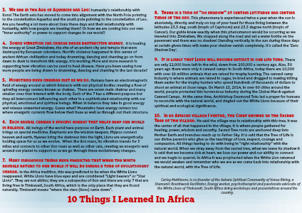 10. In an African village I visited, the Chief showed us the Sacred Tree of the village. He said the village was in relationship with this tree, it was the center of all that happened in the village, it is where people gathered for healing, power, wisdom and security. Sacred Tree roots are anchored deep into Mother Earth and branches reach up to Father Sky. It is said that the Tree of Life is our divine parent/s who give us the teachings of love, respect, courage and compassion. All things having to do with being in “right relationship” with the natural world. When we stray away from the sacred tree, when we leave its shadow it is said that we become sick at heart, we lose our power and our ability to connect and we begin to quarrel. In Africa it was prophesied when the White Lion returned we would awaken and remember who we are as we come back into relationship with the natural world, with the Tree of Life.