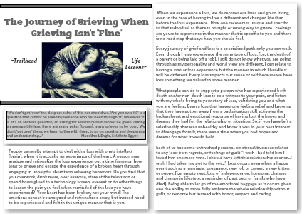 When we experience a loss, we do recover our lives and go on living, even in the face of having to live a different and changed life than before the loss experience. How one recovers is unique and specific to that individual as there is no right or wrong way to grieve. Feelings are yours to experience in the manner that is specific to you and there is no road map that says how you should feel.