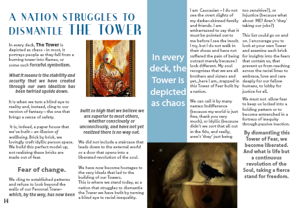 This list could go on and on. I encourage you to look at your own Tower and examine each brick for insights into the fears that contain us, that prevent us from reaching across the racial lines to embrace, love and care deeply for our fellow humans, to lobby for justice for all.
