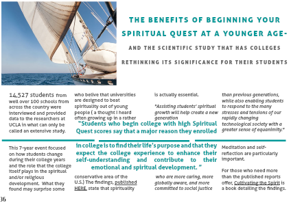 This 7-year event focused on how students change during their college years and the role that the college itself plays in the spiritual and/or religious development. What they found may surprise some who belive that universities are designed to beat spirituality out of young people ( a thought I heard often growing up in a rather