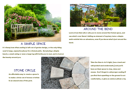 It 's funny how often seating is left out of garden design, or the only thing used is large, expensive pieces for a formal patio. But placing a simple bench, a small swing or even a large log will invite you to rest, and to look at the beauty around you.