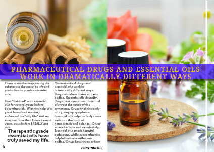 Pharmaceutical drugs and essential oils work in dramatically different ways. Drugs introduce toxins into our bodies. Essential oils detoxify. Drugs treat symptoms. Essential oils treat the cause of the symptoms. Drugs trick the body into giving up symptoms. Essential oils help the body come back into the truth of homeostasis and balance. Drugs attack bacteria indiscriminately. Essential oils attack harmful pathogens, while supporting the helpful bacteria within our bodies. Drugs have three or four chemical components, allowing pathogens to mutate and find other ways to attack our bodies. Essential oils consist of hundreds of chemical components which can block many mutations attempted by pathogens.