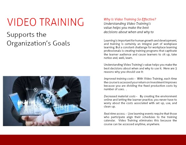 Improved training costs - With Video Training, each time the course is accessed your return on investment improves because you are dividing the fixed production costs by number of uses. .