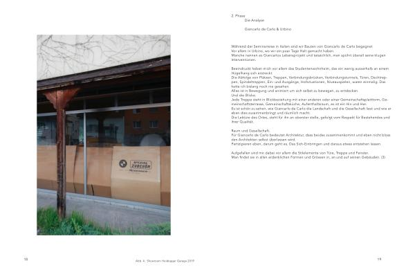 Während der Seminarreise in Italien sind wir Bauten von Giancarlo de Carlo begegnet . Vor allem in Urbino , wo wir ein paar Tage Halt gemacht haben . Manche nennen es Giancarlos Lebensprojekt und tatsächlich , man spührt überall seine klugen Interventionen .