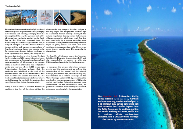 The Curonian Spit (Lithuanian: Kuršių nerija, Russian: Куршская коса, German: Kurische Nehrung, Latvian: Kuršu kāpas) is a 98 km long, thin, curved sand-dune spit that separates the Curonian Lagoon from the Baltic Sea coast. Its southern portion lies within Kaliningrad Oblast, Russia and its northern within southwestern Lithuania. It is a UNESCO World Heritage Site shared by the two countries.
