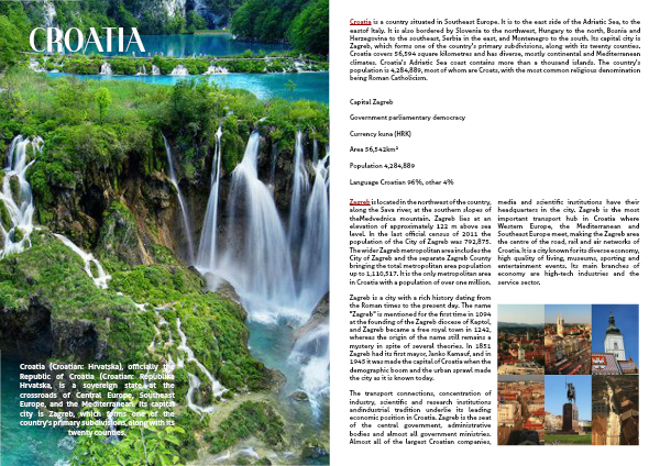Croatia (Croatian: Hrvatska), officially the Republic of Croatia (Croatian: Republika Hrvatska, is a sovereign state at the crossroads of Central Europe, Southeast Europe, and the Mediterranean. Its capital city is Zagreb, which forms one of the country's primary subdivisions, along with its twenty counties.