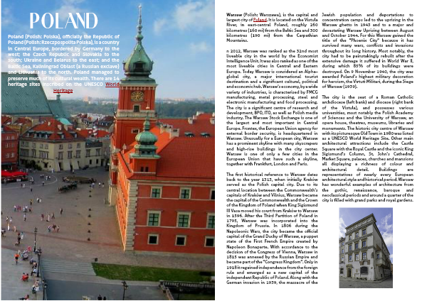 Poland (Polish: Polska), officially the Republic of Poland (Polish: Rzeczpospolita Polska), is a country in Central Europe, bordered by Germany to the west; the Czech Republic and Slovakia to the south; Ukraine and Belarus to the east; and the Baltic Sea, Kaliningrad Oblast (a Russian exclave) and Lithuania to the north. Poland managed to preserve much of its cultural wealth. There are 14 heritage sites inscribed on the UNESCO World Heritage.