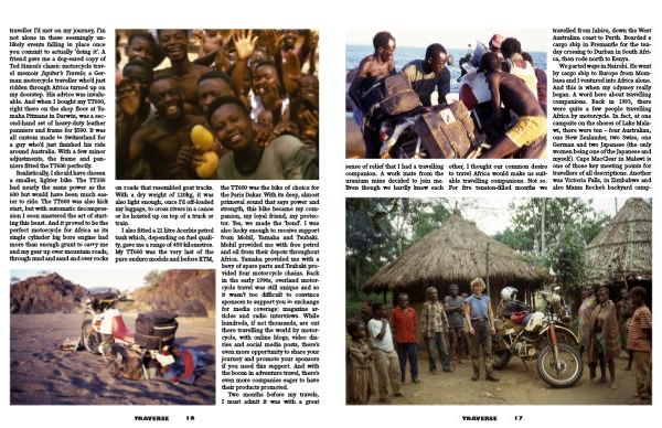 We parted ways in Nairobi . He went by cargo ship to Europe from Mombasa and I ventured into Africa alone . And this is when my odyssey really began . A word here about travelling companions . Back in 1993 , there were quite a few people travelling Africa by motorcycle . In fact , at one campsite on the shores of Lake Malawi , there were ten – four Australian , one New Zealander , two Swiss , one German and two Japanese ( the only women being one of the Japanese and myself ). Cape MacClear in Malawi is one of those key meeting points for travellers of all descriptions . Another was Victoria Falls , in Zimbabwe and also Mama Roche ’ s backyard camp-