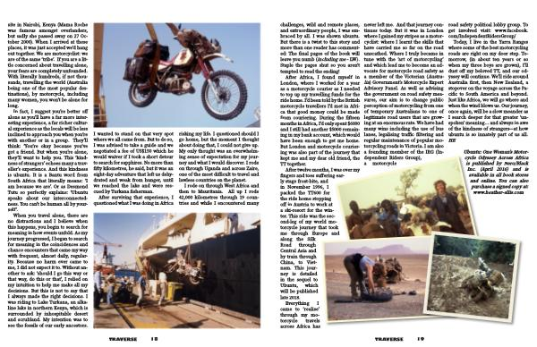 site in Nairobi , Kenya ( Mama Roche was famous amongst overlanders , but sadly she passed away on 27 October 2000 ). When I arrived at these places , it was just accepted we ’ d hang out together . We are motorcyclist : we are of the same ‘ tribe ’. If you are a little concerned about travelling alone , your fears are completely unfounded . With literally hundreds , if not thousands , travelling the world ( Australia being one of the most popular destinations ), by motorcycle , including many women , you won ’ t be alone for long .