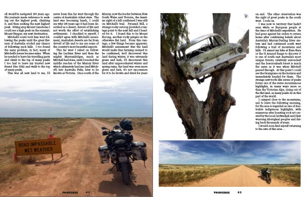Mitchell ’ s route took him west following the peaks until the great flatness of Australia eroded any chance of following such hills . I too found the same problem , in fact , many of Mitchell ’ s issues became mine . When he needed to leave his travelling party and climb to the top of many peaks I too had to leave my trusted new friend ( the GSA ) and walk to the top of many peaks .