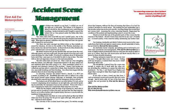 “ In removing someone else ’ s helmet there ' s a knack , it is NOT just a matter of pulling it off .” about that however , without the first aid training that three of us had I ' m certain it would ' ve be much worse . The training we had undertaken just a few months earlier was motorcycle specific , teaching things that normal first aid courses don ' t . Assessing the scene , removing hazards , ' diagnosing ' the condition of the patient and implementing a plan to secure the scene .