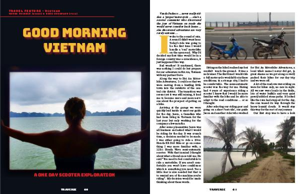 Vanda Pacheco ... never really rid- den a 'proper'motorcycle ... she's a scooter commuter who discovered the joys of Vietnam on roads she would never consider back home ... she discovered adventures are very rarely extreme ... woke to the sound of rain. A sound I didn’t want hear. Today’s ride was going to be the first time I would handle a ‘real’ motorbike on the open road. Why I'd decided my first time would be in a foreign country was a coincidence, it just happened this way. Bad weather! It continued, there was nothing I could do but prepare for our adventure in Hoi An, Vietnam with my partner Dave. Along the way to Hoi An Motor- bike Adventures, I could see that we were moving from a bustling little town into the outskirts of the cen- tral city district. The transition was serene yet it was still raining, it lead me to become more and more nerv- ous about the prospect of getting on a bike. Arriving at the garage we were quickly lead inside to meet our guide for the day, Jason, a Canadian who had been living in Vietnam for the last year but only working for the company a few months. After some pleasantries Jason was all business and asked what I would be riding for the day. It was crunch time, a decision needed to be made. I was either going to ride a 150cc Honda XR Dirt Bike or go on some- thing I was more familiar with; a 125cc Honda Wave semi-automatic scooter. With that in mind I thought about what a friend once told me. He said “You need to feel comfortable to ride a motorbike. If you aren’t com- fortable you won’t have confidence which is something you need. Yes a little fear is also needed but that is to remind you of the machine you’re riding”. My decision would be made thinking about those words. I Sitting on the bike I realised my feet couldn’t touch the ground. It was a no brainer. The first time I would ride a full motorcycle wouldn’t be in these conditions; in a strange city, I had to be comfortable. The semi-automatic scooter was the way for me. Having had 4 years of experience riding a scooter I knew that I would be more familiar with the bike and be able to adapt to the road conditions … or so I thought. After selecting our riding gear and going on a short ‘test ride’, our guide Jason and another rider who worked TRAVERSE 61 for Hoi An Motorbike Adventures, a local who’s name I never did get, (a great shame as we got along so well) packed their bikes for our day trip and we were off. A lot of the roads we were riding on were for bikes only, no cars in sight. All we saw were locals in the fields, lots of water buffalo and very quiet paved/cobbled stone paths. It looked like the rain had stopped for the day, the sun teased its way through the heavy humid clouds. It would stay this way for the rest of our journey. Our first stop was to have a look