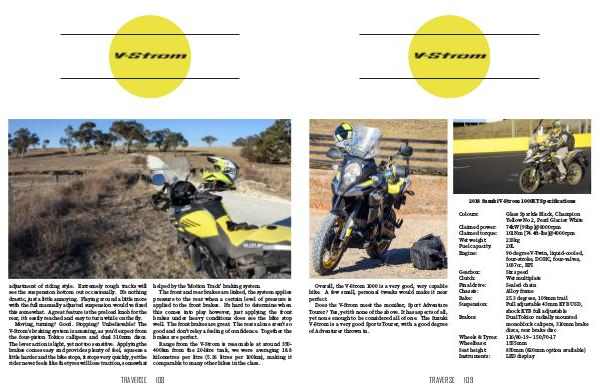 adjustment of riding style. Extremely rough tracks will see the suspension bottom out occasionally. It’s nothing drastic, just a little annoying. Playing around a little more with the full manually adjusted suspension would’ve fixed this somewhat. A great feature is the preload knob for the rear, it’s easily reached and easy to turn while on the fly. Moving, turning? Good. Stopping? Unbelievable! The V-Strom’s braking system is amazing, as you’d expect from the four-piston Tokico callipers and dual 310mm discs. The lever action is light, yet not too sensitive. Applying the brakes comes easy and provides plenty of feel, squeeze a little harder and the bike stops, it stops very quickly, yet the rider never feels like the tyres will lose traction, somewhat helped by the ‘Motion Track’ braking system. The front and rear brakes are linked, the system applies pressure to the rear when a certain level of pressure is applied to the front brakes. It’s hard to determine when this comes into play however, just applying the front brakes under heavy conditions does see the bike stop well. The front brakes are great. The rears alone aren’t so good and don’t relay a feeling of confidence. Together the brakes are perfect. Range from the V-Strom is reasonable at around 350- 400km from the 20-litre tank, we were averaging 18.8 kilometres per litre (5.36 litres per 100km), making it comparable to many other bikes in the class. TRAVERSE 108