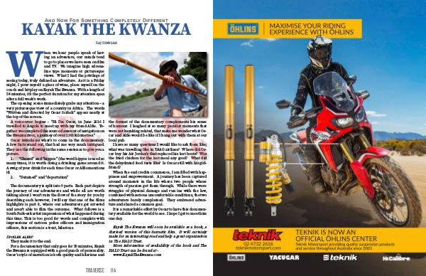 And Now For Something Completely Different KAYAK THE KWANZA W Saj Sinniah hen we hear people speak of hav- ing an adventure, our minds tend to go to places we have seen on film and TV. We imagine high adrena- line type moments or picturesque views. What I had the privilege of seeing today, truly defined an adventure. As it is a Friday night, I pour myself a glass of wine, place myself on the couch and hit play on Kayak The Kwanza. With a length of 54 minutes, it’s the perfect duration for my attention span after a full week’s work. The opening scene immediately grabs my attention – a very picturesque view of a country in Africa. The words “Written and directed by Oscar Scifadi” appear neatly at the top of the screen. A voice-over begins - “Hi I’m Oscar, in June 2016 I travelled to Angola to meet up with my friend Alfie. To- gether we completed the sourced amount of navigation on the Kwanza river, a journey of over 1300 kilometres.” Oscar introduces what’s to come in the documentary. A few facts stand out, that had me very much intrigued. They use the following in the same sentence to give you a picture. 1. “Chased” and “hippos” (the word hippos is used so many times, it is worth doing a drinking game around it. A swig of your drink for each time Oscar or Alfie mentions it) 2. “Detained” and “deportation” R E V The documentary is split into 9 parts. Each part depicts the journey of our adventurers and while all are worth talking about I won't ruin the flow of the story for you by describing each however, I will say that one of the films highlights is part 8, where our adventurers get arrested and aren't able to film the outcome. What follows is a South Park-esk artist impression of what happened during this time. This is too good for words and complete with impressions of cartoon police officers and immigration officers, this section is a treat, hilarious. Spoiler alert They make it to the end. For a documentary that only goes for 50 minutes, Kayak the Kwanza is equipped with a good punch of personality. Oscar’s style of narration is both quirky and hilarious and I W the format of the documentary complements his sense of humour. I laughed at so many peculiar moments that were not kayaking related, that make me wonder what Os- car and Alfie would be like if I hung out with them at our local pub. I have so many questions I would like to ask them like; what was travelling like in TAAG airlines? Where did Os- car buy his Air Jordan's that replaced his lost boots? Was the fried chicken for the last meal any good? What did the dehydrated food taste like? Is Oscar still with his girl- friend? When the end credits commence, I am filled with hap- piness and empowerment. A journey has been captured around moments in the life where two people whose strength of passion got them through. While there were struggles of physical damage and run ins with the law, combined with serious uncomfortable conditions, the two adventurers barely complained. They embraced adven- ture and shared a common goal. It is a remarkable effort by Oscar to have this documen- tary available for the world to see. I hope I get to meet him one day. E S Kayak The Kwanza will soon be available as a book, a diarised version of this fantastic film. It will certainly make for an interesting read and help a great organisation in The HALO Trust. More information of availability of the book and The HALO Trust can be found at - www.KayakTheKwanza.com TRAVERSE 114