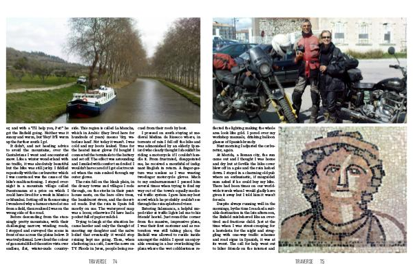 er, and with a "I'll help you, Pet!" he got the Enfield going. Neither was it sunny and warm, but 'Hey! It'll warm up the further south I go'. It didn't, and not heeding advice to avoid the mountains, over the Cantabrians I went and encountered snow. Like a winter wonderland with no traffic, it was absolutely beautiful but the bike was still jerky. I fiddled repeatedly with the carburettor which I was convinced was the cause of the bike’s malfunctioning. I stayed over- night in a mountain village called Puentenansa at a price on which I could have lived for a week in Mexico or Mumbai. Setting off in the morning I wondered why a farmer stared at me from a field, then realised I was on the wrong side of the road. Before descending from the stun- ningly pretty mountains, with their challenging narrow, winding roads, I stopped and surveyed the scene in front of me across the plains below. It was truly dismal. Low cloud the colour of gun metal filled the entire vista over endless, flat, winter-nude country- side. This region is called La Mancha, which in Arabic (they lived here for hundreds of years) means ‘dry, wa- terless land’. Not today it wasn’t. I was cold and my boots leaked. Time for the heated inner gloves I’d bought! I connected the terminals to the battery and set off. The effect was astounding and I smiled with comfort and relief. I wouldn’t have cared if I got electrocut- ed when the rain soaked through my outer gloves. The rain fell on the bleak plain, in the dreary towns and villages I rode through, on the storks in their pent- house nests, on the bare olive trees, the bank-burst rivers, and the desert- ed roads. But the rain in Spain fell mostly on me. The waterproof map was a boon; otherwise I’d have had a pocket full of papier mâché. Trying to laugh at the situation be- came harder and only the thought of meeting my daughter and the naїve belief that eventually it would stop raining kept me going. Then, when sheltering in a café, I saw the news on TV. Floods in Jerez, people being res- TRAVERSE 74 cued from their roofs by boat. I pressed on south staying at me- dieval Medina de Rioseco where, in torrents of rain I fell off the bike and was admonished by an elderly Span- iard who clearly thought I shouldn’t be riding a motorcycle if I couldn’t han- dle it. From frustrated, disappointed me, he received a mouthful of indig- nant English in return. A finger-ges- ture was useless as I was wearing two-finger motorcycle gloves. Much to my embarrassment I passed him several times when trying to find my way out of the town’s equally medie- val traffic system. I gave him my best scowl which he probably couldn’t see through the rain-splattered visor. Entering Salamanca, a helpful mo- ped rider at traffic lights led me to his friends’ hostel. Just round the corner from the massive, impressive plaza, I was their first customer and as res- toration was still taking place, the Enfield was allowed to reside inside amongst the rubble. I spent an enjoy- able evening in a bar overlooking the plaza where the wet cobblestones re-