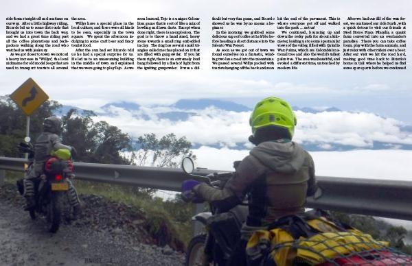 ficult but very fun game, and Ricardo showed us he was by no means a be- ginner. In the morning we grabbed some delicious cups of coffee at Le k'fée be- fore heading a short distance into the Salento Wax Forest. As soon as we got out of town we found ourselves on a fantastic, wind- ing two lane road into the mountains. We passed several Willys packed with tourists hanging off the back and soon hit the end of the pavement. This is where everyone got off and walked into the park … not us! We continued, bouncing up and down the rocky path for about a kilo- meter, leading us to some spectacular views of the valley, filled with Quindio Wax Palms, which are Colombia's na- tional tree and also the world's tallest palm tree. The area was beautiful, and evoked a different time, untouched by modern life. TRAVERSE 19 After we had our fill of the wax for- est, we continued our ride South, with a quick detour to visit our friends at Steel Horse Finca Filandia, a quaint farm converted into an overlander's paradise. There you can take coffee tours, play with the farm animals, and just relax with other riders over a beer. After our visit we hit the road hard, making good time back to Ricardo's home in Cali where he helped us find some spare parts before we continued
