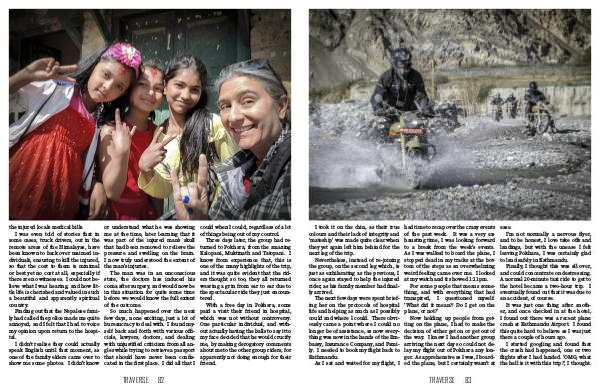 the injured locals medical bills. I was even told of stories that in some cases, truck drivers, out in the remote areas of the Himalayas, have been known to back over maimed in- dividuals, ensuring to kill the injured, so that the cost to them is minimal or best yet no cost at all, especially if there are no witnesses. I could not be- lieve what I was hearing, and how lit- tle life is cherished and valued in such a beautiful and apparently spiritual country. Finding out that the Nepalese fami- ly had called the police made me quite annoyed, and I felt that I had to voice my opinion upon return to the hospi- tal. I didn't realise they could actually speak English until that moment, as one of the family elders came over to show me some photos. I didn’t know or understand what he was showing me at the time, later learning that it was part of the injured man’s skull that had been removed to relieve the pressure and swelling on the brain. I now truly understood the extent of the man’s injuries. The man was in an unconscious state, the doctors has induced his coma after surgery, and would now be in this situation for quite some time before we would know the full extent of the outcome. So much happened over the next few days, none exciting, just a lot of bureaucracy to deal with. I found my- self back and forth with various offi- cials, lawyers, doctors, and dealing with unjustified criticism from all an- gles while trying to retrieve a passport that should have never been confis- cated in the first place. I did all that I TRAVERSE 82 could when I could, regardless of a lot of things being out of my control. Three days later, the group had re- turned to Pokhara, from the amazing Kalopani, Muktinath and Tatopani. I know from experience that, this is one of the many highlights of the trip, and it was quite evident that the rid- ers thought so too, they all returned wearing a grin from ear to ear due to the spectacular ride they just encoun- tered. With a free day in Pokhara, some paid a visit their friend in hospital, which was not without controversy. One particular individual, and with- out actually having the balls to say it to my face decided that he would crucify me, by making derogatory comments about me to the other group riders, for apparently not doing enough for their friend.