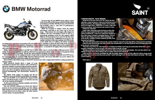 For more than 35 years BMW's boxer engines, found in the GS and RT models has propelled the larger bikes powerfully and reliably. With the release of the R1250GS and R1250RT comes a new level of performance, culture and efficiency. BMW has managed to further refine the engine smoothness especially at the lower end of the rev range. What is more, the new engine offers improved emission and fuel consumption levels as well as a particularly satisfying sound. For this purpose, BMW ShiftCam Technology has been used for the first time in the serial production of BMW Motorrad engines: this enables variation of the valve timings and valve stroke on the intake side. In addition, the intake camshafts are designed for asynchronous opening of the two intake valves, resulting in enhanced swirl of the fresh, incoming mixture and therefore more effective combustion. Other technical changes to the engine relate to the camshaft drive – now taken care of by a toothed chain (previously a roller chain) – an optimised oil supply, twin-jet injection valves and a new exhaust system. Riding modes, Stability Control and Hill Start Control, both come as standard while additional modes can be added; Dynamic Traction Control, ABS Pro, Hill Start Pro and Dynamic Brake Assist. All assist in keeping the riding safe through dynamic technology. The RT also comes with full automatic electronic suspension. The R1250GS now has the equipment feature Connectivity as standard including a 6.5-inch full-colour TFT screen. In conjunction with the standard BMW Motorrad Multi-Controller, this means the rider can access vehicle and connectivity functions particularly swiftly and conveniently. The R1250RT is fitted with a large 5.7-inch TFT colour screen. This is supplemented with an analog speedometer and rev counter. BMW Motorrad Spezial offers a range of iconic customisation features that enhance both performance and value, available as optional equipment items ex works. The focus is on harmonious integration in the vehicle as a whole, use of the very highest-quality materials, elaborate manual workmanship and characteristic attention to detail. The Billets Packs Option 719 Classic and HP are available for the new R1250GS and R1250RT, for example. The new R1250RT can be additionally enhanced with Option 719 wheels Classic or Sport, an exclusive seat and one of two Spezial paint finishes. An HP sports silencer is likewise available ex works for the two new boxer models. The new R1250GS showcases its travel and off-road prowess in two modern basic finishes and two striking style variants. The new R1250RT embodies its exclusive touring character in one basic colour, two style variants and two Option 719 Spezial finishes. P R TRAVERSE 112 O D