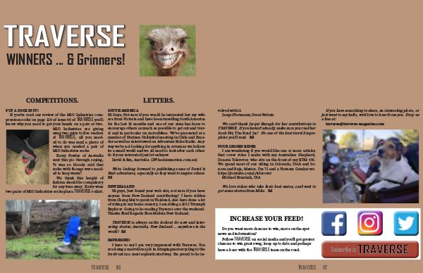 TRAVERSE WINNERS ... & Grinners! COMPETITIONS. LETTERS. PUT A SOCK IN IT! If you've read our review of the M2O Industries com- pression socks on page 110 of issue 06 of TRAVERSE you'll know why you need to get your hands on a pair or two. M2O Industries are giving away two pairs to five readers of TRAVERSE , a ll you need- ed to do was send a photo of when you needed a pair of M2O Industries socks. Kerry Fowler of Australia sent this pic through saying, "it was so bloody cold that socks with thongs were need- ed to keep warm". We think this height of fashion should be compulsary for any time away. Kerry wins two pairs of M2O Industries socks plus a TRAVERSE t-shirt. SOUTH AMERICA Hi Guys, Not sure if you would be interested but my wife are from Victoria and have been travelling South America for the last 14 months and one of our aims has been to encourage others as much as possible to get out and trav- el and in particular on motorbikes. We've presented at a number of Horizon Unlimited meeting in Chile and Ecua- dor as well as interviewed on Adventure Rider Radio. Any- way we're not looking for anything in return as we believe its a small world and we all need to look after each other. So if your interested just let us know David & Em, Australia (2Wheelsinmotion.com.au) We're looking forward to publishing some of David & Em's adventures, especially as they want to inspire others. Ed NEW ZEALAND Hi guys, Just found your web site, not sure if you have anyone from New Zealand contributing? I have ridden from Chang Mai to paint in Thailand, also have done a lot of riding in my home country, I am riding a 2013 Triumph Explorer. Going to be reading Traverse over the weekend. Thanks Kind Regards Eion Makela New Zealand. TRAVERSE is always on the lookout for new and inter- esting stories; Australia, New Zealand ... anywhere in the world! Ed IMPRESSED! I have to say I am very impressed with Traverse. You are doing a marvellous job in bringing motorcycling to the forefront in a most sophisticated way. I'm proud to be in- TRAVERSE 116