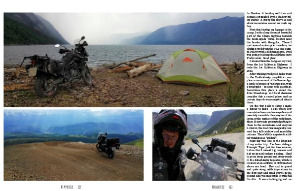 da Shadow. A bonfire, cold beer and cognac, serenaded by the Shadow rid- ers guitar. A starry sky above us and silent mountains around us made my day. Next day, leaving my luggage in the camp, I rode along the most beautiful part of the Chuya highway towards the Kosh-Agach town, located near the border with Mongolia. There I met several motorcycle travellers, in- cluding Fred from the USA on s Suzu- ki DRZ400 with California plates. Fred was going to Mongolia and then on to Vladivostok. Good plan! I showed him the badge on my vest, from the 1st California Highway. I rode the 1st California Highway in 2013. After wishing Fred good luck I went to the Tarkhatinsky megalithic com- plex - a monument of the Bronze Age: a circle of stones of various sizes, with petroglyphs - ancient rock paintings. Sometimes this place is called the Altai Stonehenge and local shamans consider this a sacred place and on certain days do some mystical rituals there. On the way back to camp I made a detour to Mars - a site where low mountains have a red-orange hue and remotely resemble the canyons of Ar- izona or the surface of the red planet, Mars. Heavy rain prevented getting to close to the mountains and canyons however, the road was magically cov- ered by a full rainbow and incredible colours. There’s little surprise that Al- tai translates as “golden”! Next day was one of the brightest of my entire trip. I’ve been riding a Triumph Tiger just for two seasons, before that I owned big cruisers and had no special enduro training. I had to go on steep ground and stony roads to the Aktashinsky Repeater, which is located at an altitude of 3050 meters above sea level. The road is gravel and quite steep, with large stones in the first part and small gravel in the second and you must ride it with full throttle. It was challenging and re- TRAVERSE 63