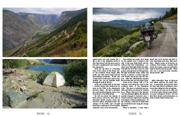 quired great care and caution, but I did it and it was definitely worth it! The Tiger made it all the more easy to ride and complimented my relatively low experience. From the top there is a stunning view of the valley of the Chuya Riv- er, the northern Chuya Range with peaks over 4000 meters high and the surrounding mountains. At the end of July, there is still snow and in clear weather you can see Belukha itself, the highest peak in Siberia. At the top I talked with an old man - a former miner who worked for 25 years in the USSR at the abandoned mercury mines. He had a wrinkled face and mutilated hands, it was clear he had had a very difficult life. He told me about the history of these places, about the dead lake of Mountain Spirits nearby, about the mercury mines abandoned after the collapse of the USSR, and I bought from him a small piece of rock quartz called the "stone rose" for memory. Descending was easier and, being on the asphalt road, I turned to the side of the pass Katu-Yaryk and the valley of the river Chulyshman – an- other must visit sight within the Altai. Through the Red Gate (narrow rocky gorge), passing dead and living lakes, through wonderful views, fields and forests, I reached a 3.5 km long pass and steeply descended into the can- yon. After the Aktashinsky repeater the road was wet, yet very easy to ride. Down in the canyon I did a 77 ki- lometers road along the river to the southern shore of the Teletskoye Lake. The place is relatively inacces- sible and there are almost no tourists here. When I first got to the lake the sun was shining brightly, the whether quickly changed, it started to rain. I relaxed and just enjoyed the amazing atmosphere of this beautiful place. In the evening I returned to Biysk with the wonderful views along the Chuya Highway. Altay is beautiful. I saw only a TRAVERSE 65 small part of its beauty and will re- turn, hopefully next year, with more time. Empty roads, no factories, no railways, few tourists, recently built hotels and camps, clean air and water, high mountains and deep lakes. What else can a real motorcycle traveller dream about? MB Mike Bibichkov lives in Moscow and oftens explores his native Rus- sia. A passionate motorcyclist since he was a kid, there's nothing he loves more than riding into the mountains. A year ago he gave up an office job to be able to take others around Russia as a part of Rusmoto Travel. You can find their details and information on rides at www.rusmototravel.com