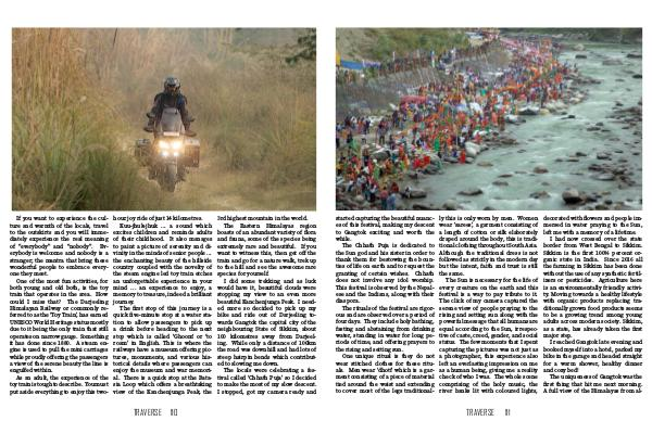 started capturing the beautiful nuanc- es of this festival, making my descent to Gangtok exciting and worth the while. The Chhath Puja is dedicated to the Sun god and his sister in order to thank them for bestowing the boun- ties of life on earth and to request the granting of certain wishes. Chhath does not involve any idol worship. This festival is observed by the Nepal- ese and the Indians, along with their diaspora. The rituals of the festival are rigor- ous and are observed over a period of four days. They include holy bathing, fasting and abstaining from drinking water, standing in water for long pe- riods of time, and offering prayers to the rising and setting sun. One unique ritual is they do not wear stitched clothes for these ritu- als. Men wear ‘dhoti’ which is a gar- ment consisting of a piece of material tied around the waist and extending to cover most of the legs traditional- ly this is only worn by men. Women wear ‘sarees’, a garment consisting of a length of cotton or silk elaborately draped around the body, this is tradi- tional clothing throughout South Asia. Although the traditional dress is not followed as strictly in the modern day but the intent, faith and trust is still the same. The Sun is necessary for the life of every creature on the earth and this festival is a way to pay tribute to it. The click of my camera captured the serene view of people praying to the rising and setting sun along with the powerful message that all humans are equal according to the Sun, irrespec- tive of caste, creed, gender, and social status. The few moments that I spent capturing the pictures was not just as a photographer, this experience also left an everlasting impression on me as a human being, giving me a reality check of who I was. The whole scene comprising of the holy music, the river banks lit with coloured lights, TRAVERSE 111 decorated with flowers and people im- mersed in water praying to the Sun, left me with a memory of a lifetime. I had now crossed over the state border from West Bengal to Sikkim. Sikkim is the first 100% percent or- ganic state in India. Since 2016 all the farming in Sikkim has been done without the use of any synthetic fertil- izers or pesticides. Agriculture here is an environmentally friendly activi- ty. Moving towards a healthy lifestyle with organic products replacing tra- ditionally grown food products seems to be a growing trend among young adults across modern society. Sikkim, as a state, has already taken the first major step. I reached Gangtok late evening and booked myself into a hotel, parked my bike in the garage and headed straight for a warm shower, healthy dinner and cozy bed! The uniqueness of Gangtok was the first thing that hit me next morning. A full view of the Himalayas from al-