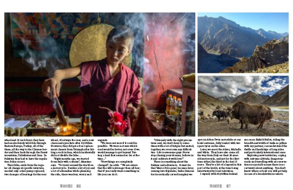 wheel and 21 inch front, they have had an absolutely wild ride through Eastern Europe, Turkey, all of the Stans, all the way to the Chinese bor- der and then back through the Pamir mountains, Uzbekistan and Iran. In Pakistan they had to have the regula- tion Police escort. Their bike, aside from the regu- lar oil change at specific intervals, needed only a fuel pump replaced; two changes of bearings for the rear wheel, it’s always the rear, and a new chain and sprockets after 43,000km. However, they did get a free replace- ment chassis from Triumph after hit- ting a rock in Iran, which incidentally did not disable the bike … “Eight months ago, we started from Italy with a dream”, Massimo says. “To travel around the world on a motorcycle. Besides a lot of joy and a lot of adrenaline while planning the ride, there was fear, worry and TRAVERSE 106 anguish. “We were not sure if it could be possible. We were not sure which road would be better, not even if we would manage to get beyond Tur- key, a land that seemed so far at the time…” “Now things are completely changed”, he adds. “We are aware that the will is stronger than all fear; that if you really want something in life you can do it.