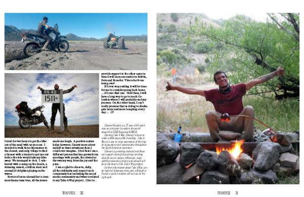 provide support to the other associa- tions I will soon encounter in Bolivia, Peru and Ecuador. This is far from being over! If I ever stop smiling it will be time for me to consider going back home … if I ever find one. Until then, I still have a long way to go to reach Co- lombia where I will probably end my journey. On the other hand, I can’t really promise that as riding to Alaska gets more and more tempting every day … CR I tried for two hours to get the bike out of the sand with no success. I decided to walk three kilometres to the closest, and only, village to find a farmer with a tractor to get me out before the tide would take my bike away. We managed to do it. I cele- brated with a camp on the beach, a stunning sunset, a billion stars and around 20 dolphins playing in the waves. Stories of issue abound but a com- mon theme runs true, all the issues Clement Rouche is a 27 year old French- man on a mission to explore the world aboard his 2003 Kawasaki KLR650. Starting Take A Way, Clement is keen to make a difference while travelling. Take A made me laugh. A positive nature Way is a way to raise awareness of the frag- helps however, I learnt more about ile ecosystems and communities throughout myself in these situations than I the South American continent. could ever imagine. I feel that I am a Clement is providing material and finan- different person that has grown from cial support during his journeys and ding meetings with people, the obstacles what he can to make a difference, many thrown my way, from the joy and the wildlife protection centers and schools will pain. be at the heart of the Take A Way project. I am so glad to observe, daily, Further information about Take A Way can all the solidarity and respect each be found at takeaway-moto.com, although in community has including the social French a quick translate will set you on the media community and what is related right path. to my Take A Way project. I live to TRAVERSE 30
