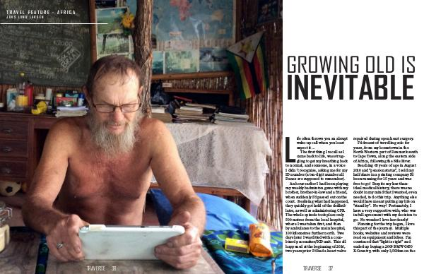 GROWING OLD IS INEVITABLE L ife often throws you an abrupt wake-up call when you least expect it … The first thing I recall as I came back to life, was strug- gling to get my breathing back to normal, and someone, in a voice I didn´t recognise, asking me for my ID number (a ten-digit number all Danes are supposed to remember). An hour earlier I had been playing my weekly badminton game with my brother, brother-in-law and a friend, when suddenly I’d passed out on the court. Realising what had happened, they quickly got hold of the defibril- lator, as well as administering CPR. The whole episode took place only 500 metres from the local hospital, where I was taken first, and then by ambulance to the main hospital, 100 kilometres further north. Two days later I was fitted with a com- bined pacemaker/ICD unit. This all happened at the beginning of 2016, two years prior I’d had a heart valve TRAVERSE 37 repaired during open heart surgery. I’d dreamt of travelling solo for years, from my hometown in the North Western part of Denmark south to Cape Town, along the eastern side of Africa, following the Nile River. Reaching 65 years of age in August 2018 and “pension status”, I sold my half share in a printing company I’d been running for 15 years and was free to go! Despite my less-than- ideal medical history, there was no doubt in my mind that I wanted, even needed, to do this trip. Anything else would have meant putting my life on “stand by”. No way! Fortunately, I have a very supportive wife, who was in full agreement with my decision to go. No wonder I love her dearly! Planning for the trip began, I love this part of the journey. Multiple books, websites and reviews were read on equipment and bikes. I’m convinced that “light is right” and ended up buying a 2009 BMW G650 X-Country, with only 3,500km on the