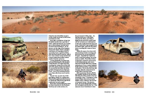 why it became Birdsville except to say the name stuck and in 1882 it was proclaimed a town. Now with a population of just 140, Birdsville has become a parody of itself. Outback? Remote? Or a tourist mecca that perhaps wouldn’t exist if it was located elsewhere. Its ex- istence, on the edge of the Simpson Desert is its draw. Those 1,100 plus sand dunes, all running parallel to each other, have a spell over Birds- ville that has helped it survive, with it has come a horse racing carnival and a music festival that draws in thou- sands of tourists each year. Leaving Birdsville, heading west and now following the 26th parallel south latitude, as Poeppel had after reaching the conjunction of the 26th and 141st, had so many years before, we crossed the first dune into Mun- ga Thirri (Simpson Desert National Park). A sea of red stretched before us as dune after dune rose from the plain. Up and over, up and over, it felt like riding a dingy on a rolling surf. What had Poeppel and fellow survey- or Alexander Salmond thought when confronted by such a sight? More than seventy kilometres later we found ourselves in the Northern Territory and on the surface of a TRAVERSE 108