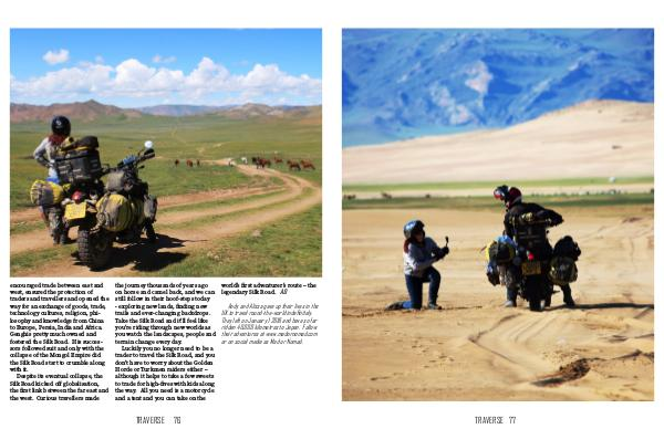 encouraged trade between east and west, ensured the protection of traders and travellers and opened the way for an exchange of goods, trade, technology cultures, religion, phi- losophy and knowledge from China to Europe, Persia, India and Africa. Genghis pretty much owned and fostered the Silk Road. His succes- sors followed suit and only with the collapse of the Mongol Empire did the Silk Road start to crumble along with it. Despite its eventual collapse, the Silk Road kicked off globalisation, the first link between the far east and the west. Curious travellers made the journey thousands of years ago world’s first adventurer’s route – the on horse and camel back, and we can legendary Silk Road. AD still follow in their hoof-steps today - exploring new lands, finding new Andy and Alissa gave up their lives in the trails and ever-changing backdrops. UK to travel round-the-world indefinitely. Take the Silk Road and it’ll feel like They left on January 1 2018 and have so far you’re riding through new worlds as ridden 40,000 kilometres to Japan. Follow you watch the landscapes, people and their adventures at www.madornomad.com terrain change every day. or on social media as Mad or Nomad. Luckily you no longer need to be a trader to travel the Silk Road, and you don’t have to worry about the Golden Horde or Turkmen raiders either – although it helps to take a few sweets to trade for high-fives with kids along the way. All you need is a motorcycle and a tent and you can take on the TRAVERSE 76