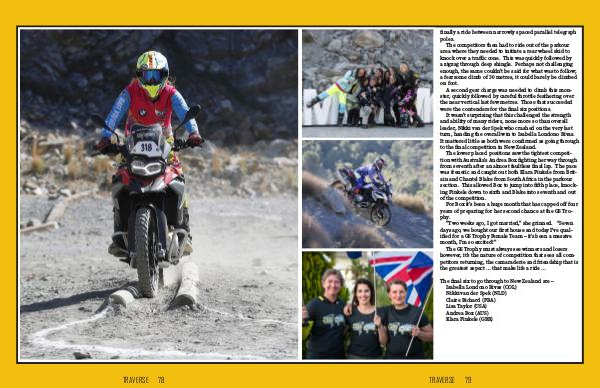 finally a ride between narrowly spaced parallel telegraph poles. The competitors then had to ride out of the parkour area where they needed to initiate a rear wheel skid to knock over a traffic cone. This was quickly followed by a zigzag through deep shingle. Perhaps not challenging enough, the same couldn’t be said for what was to follow; a fearsome climb of 30 metres, it could barely be climbed on foot. A second gear charge was needed to climb this mon- ster, quickly followed by careful throttle feathering over the near vertical last few metres. Those that succeeded were the contenders for the final six positions. It wasn’t surprising that this challenged the strength and ability of many riders, none more so than overall leader, Nikki van der Spek who crashed on the very last turn, handing the overall win to Isabella Londono Rivas. It mattered little as both were confirmed as going through to the final competition in New Zealand. The lower placed positions saw the tightest competi- tion with Australia’s Andrea Box fighting her way through from seventh after an almost faultless final lap. The pace was frenetic and caught out both Klara Finkele from Brit- ain and Chantel Blake from South Africa in the parkour section. This allowed Box to jump into fifth place, knock- ing Finkele down to sixth and Blake into seventh and out of the competition. For Box it’s been a huge month that has capped off four years of preparing for her second chance at the GS Tro- phy. “Two weeks ago, I got married,” she grinned. “Seven days ago, we bought our first house and today I’ve qual- ified for a GS Trophy Female Team – it’s been a massive month, I’m so excited!” The GS Trophy must always see winners and losers however, it’s the nature of competition that sees all com- petitors returning, the camaraderie and friendship that is the greatest aspect … that make life a ride … The final six to go through to New Zealand are – Isabella Londono Rivas (COL) Nikki van der Spek (NLD) Claire Bichard (FRA) Lisa Taylor (USA) Andrea Box (AUS) Klara Finkele (GBR) NEWS MAGAZINE 79 TRAVERSE 79