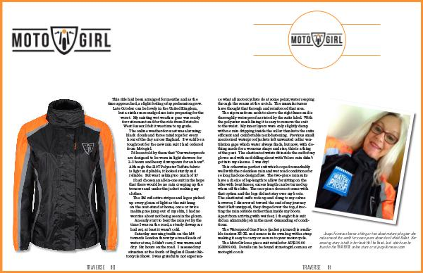 This ride had been arranged for months and as the time approached, a slight feeling of apprehension grew. Late October can be lovely in the United Kingdom, but a sixth sense nudged me into preparing for the worst. My existing wet weather gear was ready for retirement and for the ride from Bristol to West Sussex I felt it was time to upgrade. The online weather-forecast was alarming; black clouds and three raindrops for every hour of the day across England. It would be a tough test for the new rain suit I had ordered from Motogirl. I’d been told by them that “Our waterproofs are designed to be worn in light showers for 2-3 hours and heavy downpours for an hour”. Although the 210T Polyester Taffeta fabric is light and pliable, it looked sturdy and reliable. But was I asking too much of it? I had chosen an all-in-one suit in the hope that there would be no rain creeping up the trousers and under the jacket soaking my clothes. The 3M reflective stripes and logos picked up every gleam of light as the suit hung on the coat-stand at home, once or twice making me jump out of my skin, I had no worries about not being seen in the gloom. An early start to beat the rain yet by the time I was on the road, a steady downpour had set, at least it wasn’t cold. Saturday morning traffic on the M4 towards London threw tyre-tread loads of water at me, I didn’t care; I was warm and dry. Six hours on the road. I assessed my situation at the South of England Classic Mo- torcycle Show. I was grateful to not experien- TRAVERSE 110