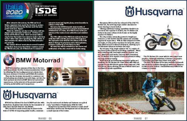 After extensive discussions, the FIM and local Italian organisers have made the decision to postpo- ne the International Six Day Enduro until the same period next year; August. Whilst the ISDE was not due to take place until late August early September of this year - between Lom- bardy and Piedmont, Italy - there are many influen- cing factors that made it necessary to make a decision sooner rather than later regarding the 95th edition of what remains the oldest event in the FIM internatio- nal calendar. The annual off-road event attracts several hundred competitors from more than thirty countries around the World each year, all of whom have to commit to N extensive travel and logistic plans, several months in advance of the ISDE. Moreover, the ISDE demands many months of forward planning and work to prepare many hundred of kilometres of course, all of which rely on the per- mission of the various local authorities and stakehol- ders. The 95th edition of the FIM International Six Days of Enduro will now take place from 30th August to 4th September 2021 with the 5th edition of the FIM Enduro Vintage Trophy from 2nd to 4th September, between Lombardy and Piedmont in Italy. All entry fees will be refunded in due course and notification of the 2021 event will be forthcoming. E W S BMW Motorrad has announced that due to the Coro- navirus pandemic that the German manufacturer won't be attending the two leading motorcycle shows later this year; Intermot (October) and EICMA (November). They say the decission was made to counteract cur- rent planning uncertainty at an early stage, and also for their partners involved in BMW Motorrad motorshow appearances, in the interests of the greatest possible security, predictability and transparency. KTM AG has followed the lead of BMW and also with- drawn from all global trade shows for the remainder of 2020, these include Intermot and EICMA. "(We) decided to make several key decisions in the wake of COVID-19 impacting public health, communi- ties, the motorcycle industry and business on a global scale," says Hubert Trunkenpolz, KTM AG CMO. Husqvarna say that they will continue to 'push ahead' with future models and development and see this just as a small squeeze of the brakes. TRAVERSE 126